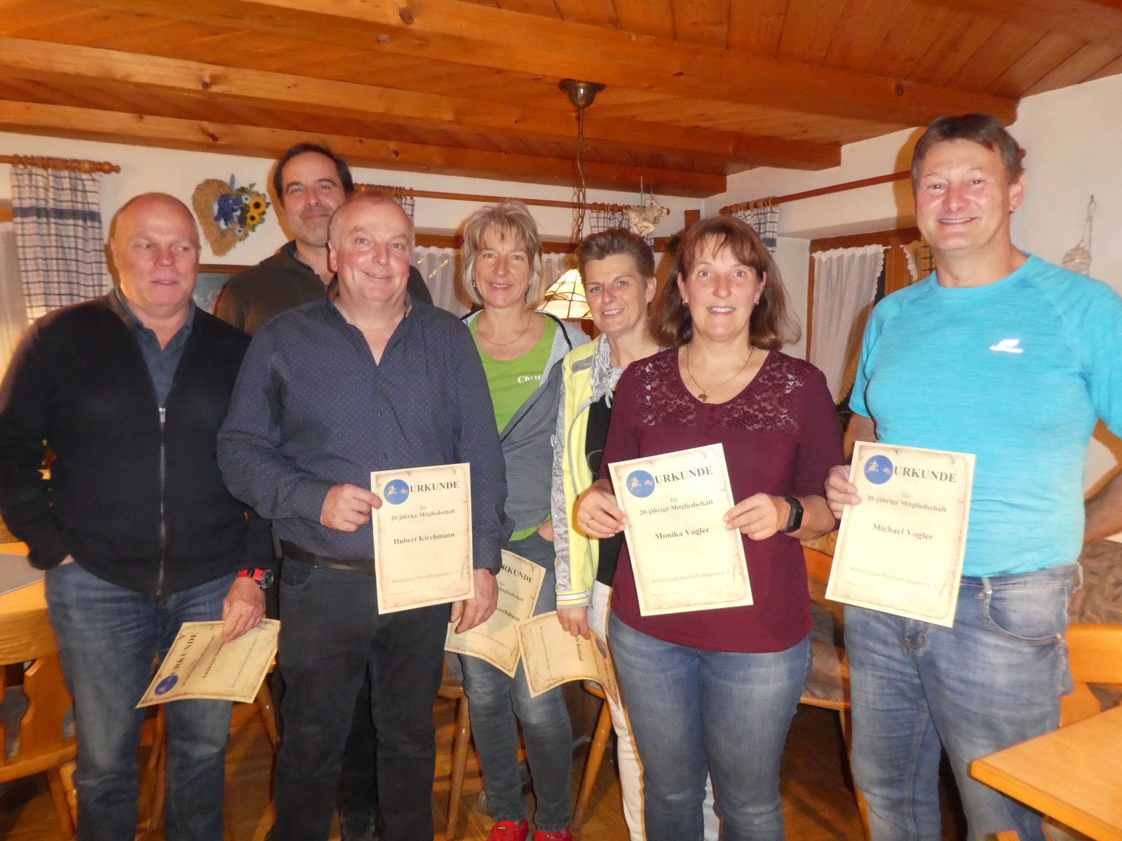 Nachdem dieses Jahr das 20jährge Vereinsbestehen gefeiert werden kann, dürfen einige Gründungsmitglieder für 20 Jahre Vereinszugehörigkeit geehrt werden. Diese Ehrung übernimmt Angelika Frommknecht. Sie gratuliert somit Hubert und Christina Kirchmann, Paul Nägele, Andreas und Gabriele Baldauf, Michael und Monika Vogler. Außerdem konnten noch Petra und Norbert Rasch, Helmut Rasch, Richard Achberger, Sigi und Alex Bader, Robert Schweidler und Anja Fessler als Jubilare erwähnt werden, die leider nicht anwesend waren.