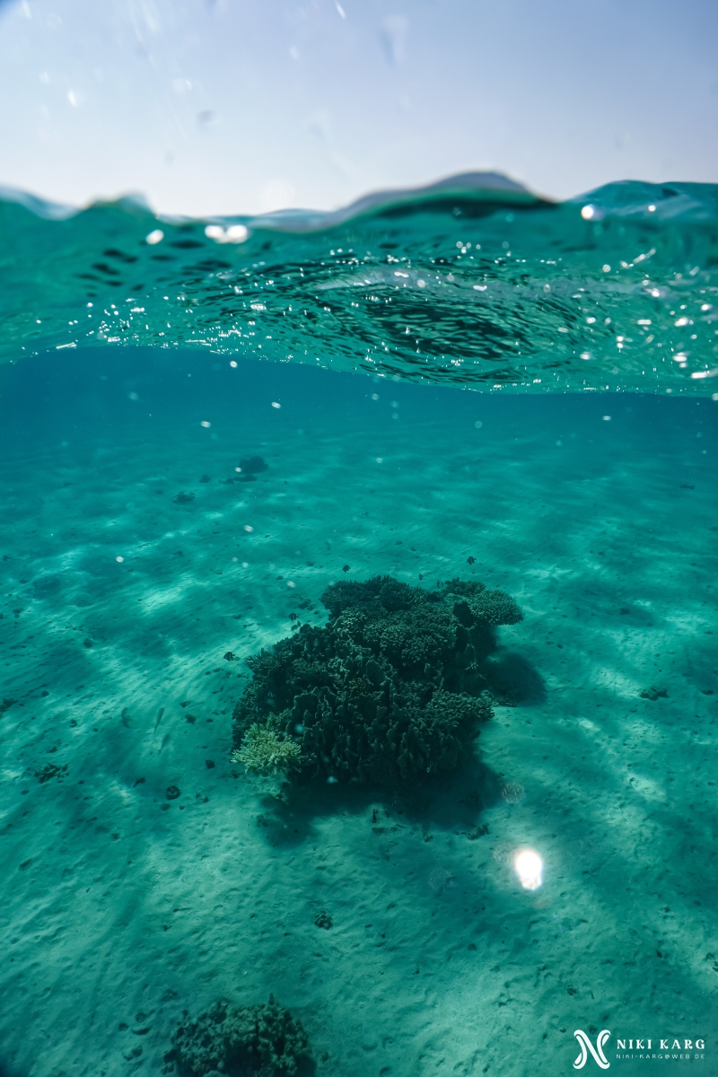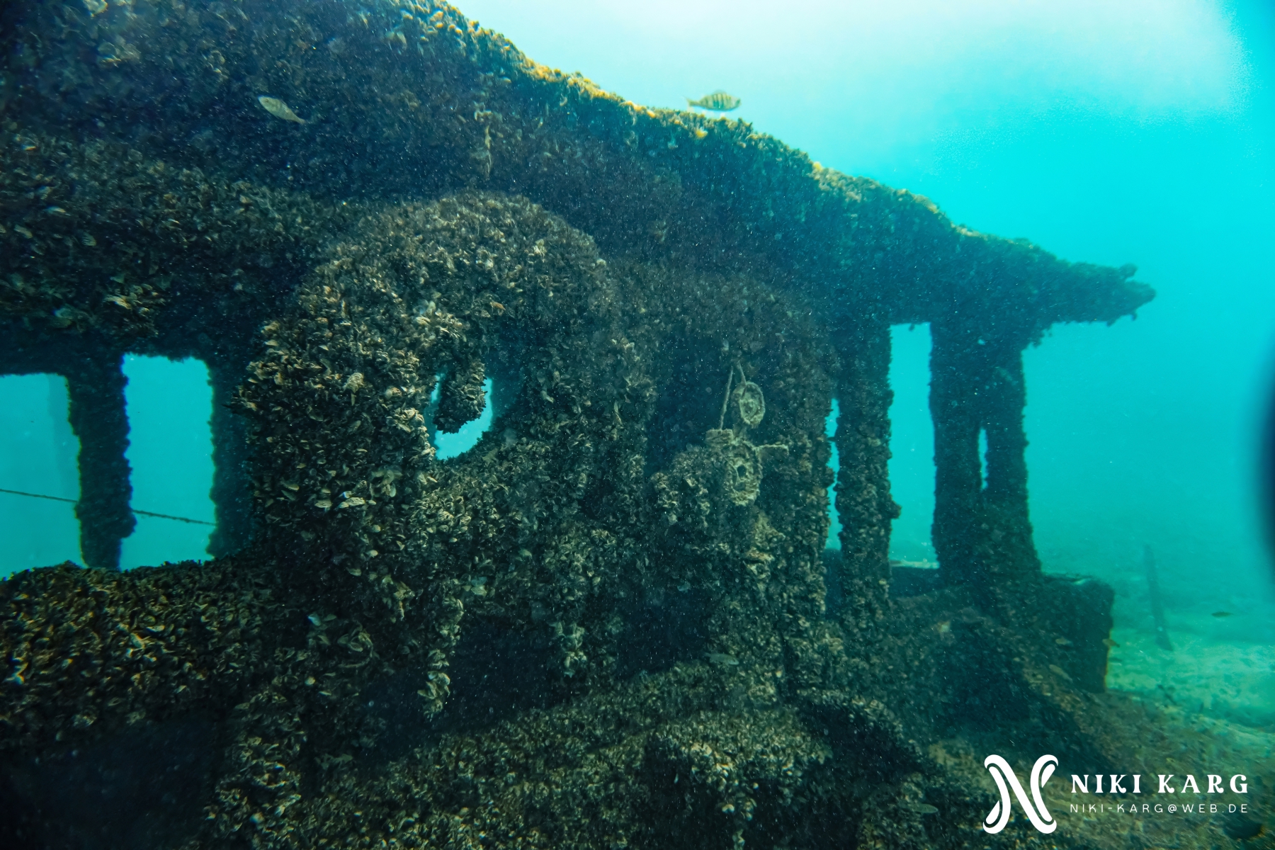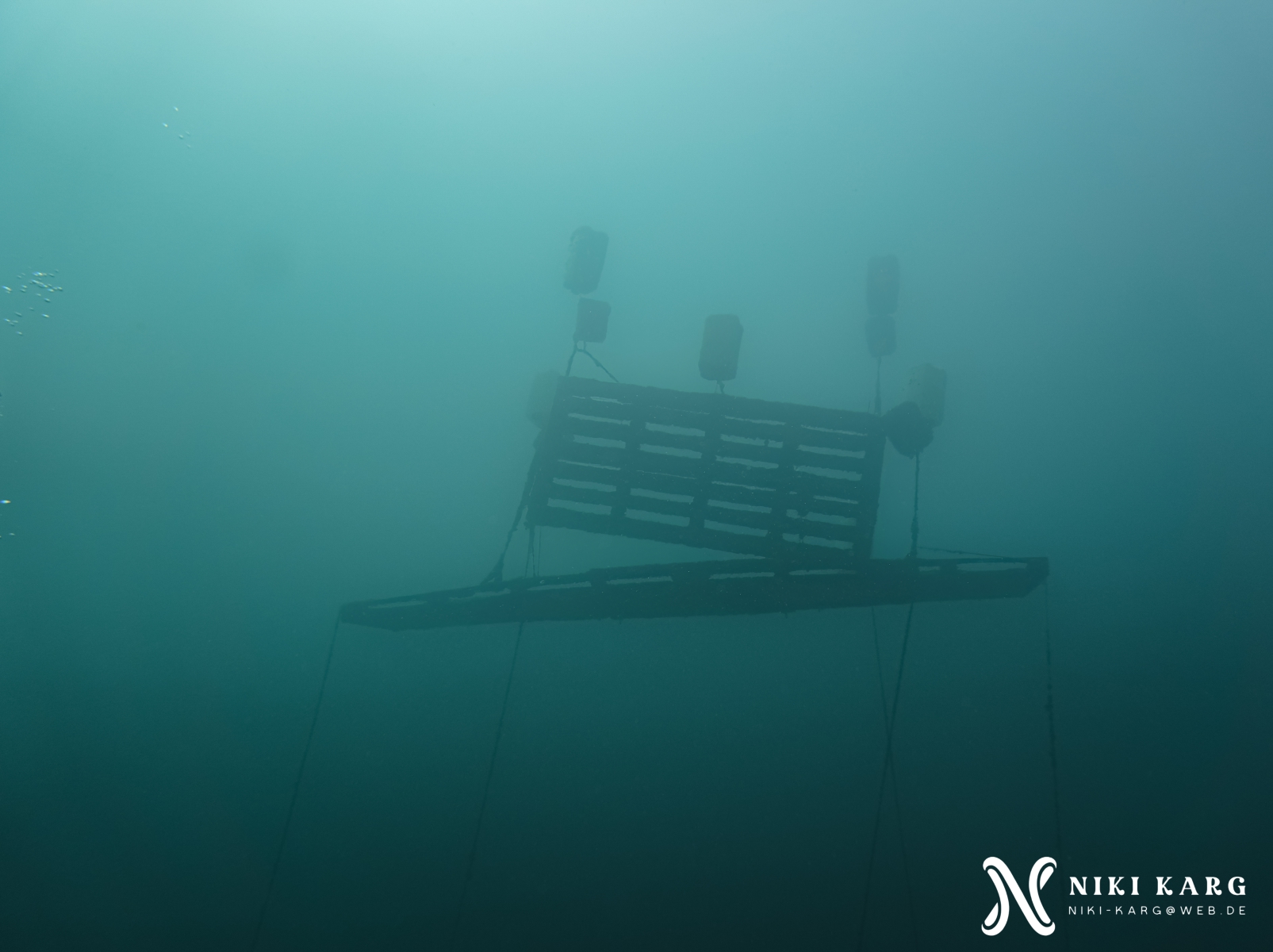 Irgendwann lässt der Sturm nach und wir können zum geplanten Early-Morning-Dive um 6 Uhr aufbrechen. Naja, die Wellen sind immer noch da, aber anscheinend wird es gehen. Draußen am Steg, bereits angezogen und zum Abtauchen bereit, möchten sich die Jungs von der Basis dann doch noch rückversichern lassen, ob wir wirklich ins Wasser können. Letztendlich bekommen wir auch grünes Licht. Wir wollten uns, wegen der Wellen unter Wasser treffen. Der Einstieg nicht ganz einfach, ab 8 Meter merkte man die Wellen aber fast nicht mehr. Spannend war dann der Ausstieg, letztendlich sind wir aber alle gesund und unversehrt wieder auf der Plattform gelandet.