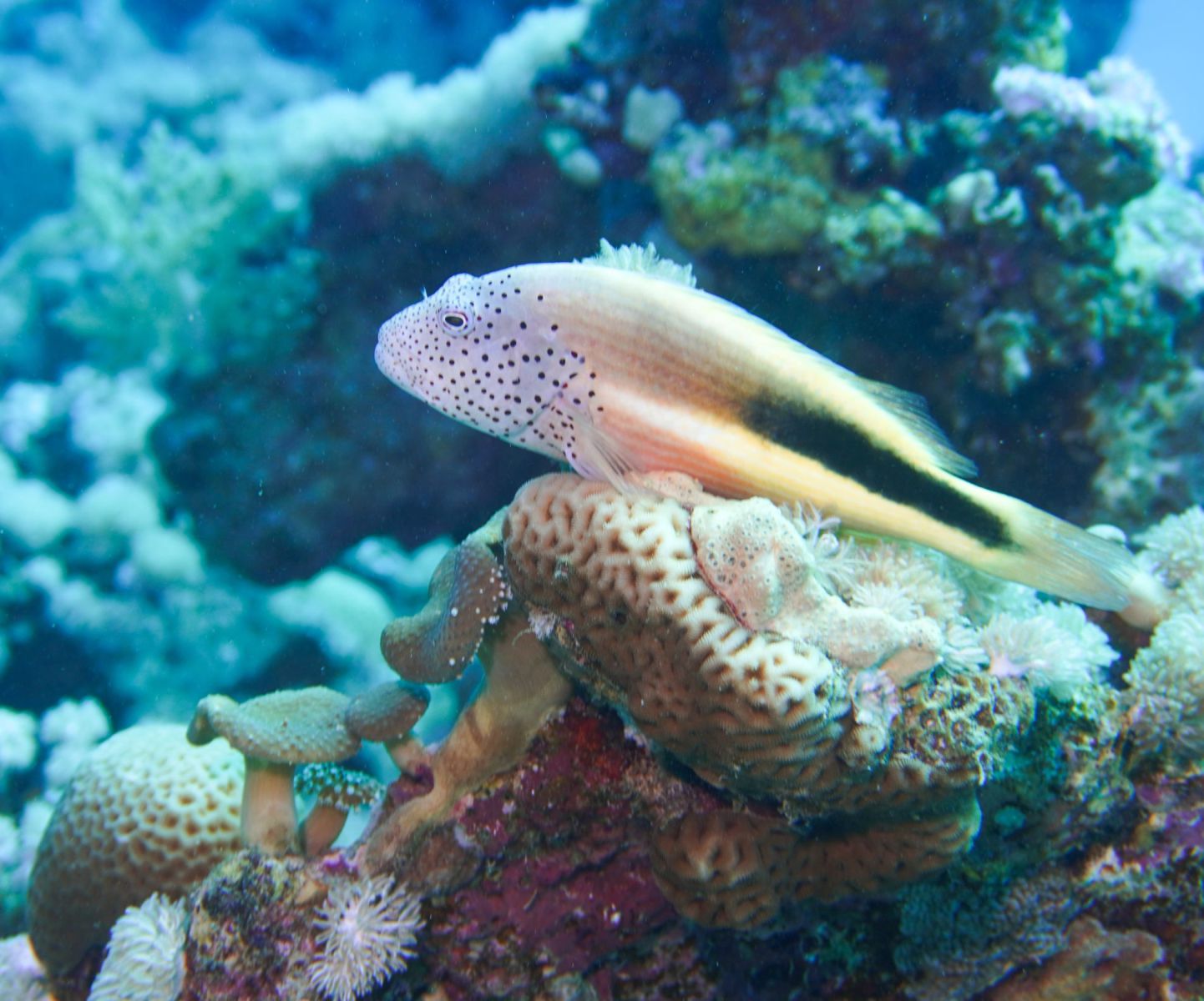 Am nächsten morgen treffen wir uns gutgelaunt zum Einchecken in der Tauchbasis. Nachmittags dürfen wir zum Checktauchgang nach einem sehr ausführlichen Briefing dann ins Wasser. Die Sicht beim ersten Abtauchen ist erst mal enttäuschend schlecht, doch mit den ersten Flossenschlägen am Hausriff entlang verbesserte sich dann auch die Sicht. Die nächsten Tage ging es dann auch immer wieder ans Hausriff, die Minibustouren und Bootstouren hatten uns im Moment noch nicht überzeugt. Wir erfahren von den Guides, dass es im Oktober und November auch sehr windig war. Das war die Erklärung, weshalb die Sicht nicht so war, wie wir es gewohnt waren. Die Wellen somit auch entsprechend vorhanden, so dass Boot auch kein Spaß macht.