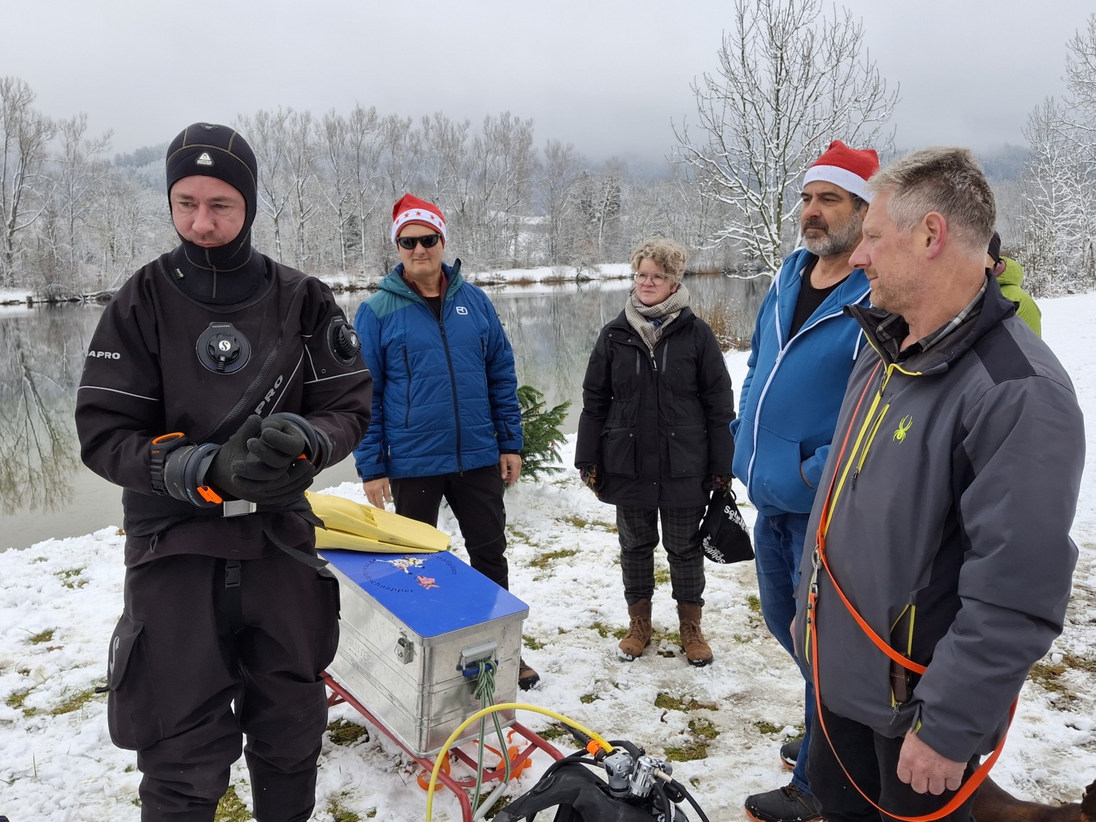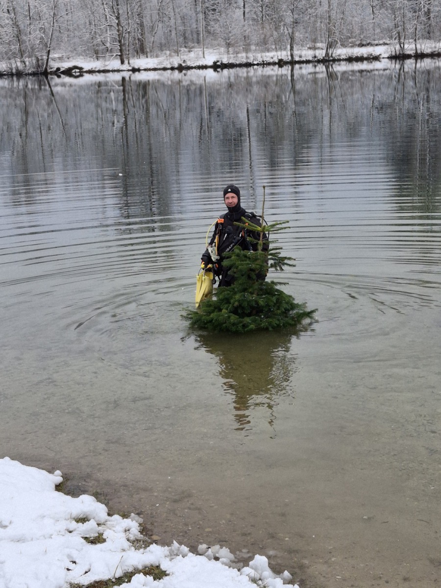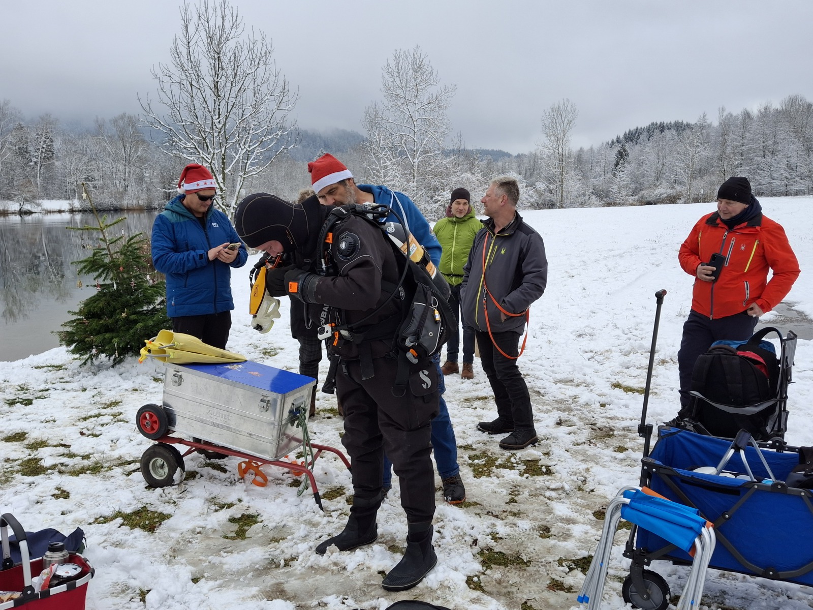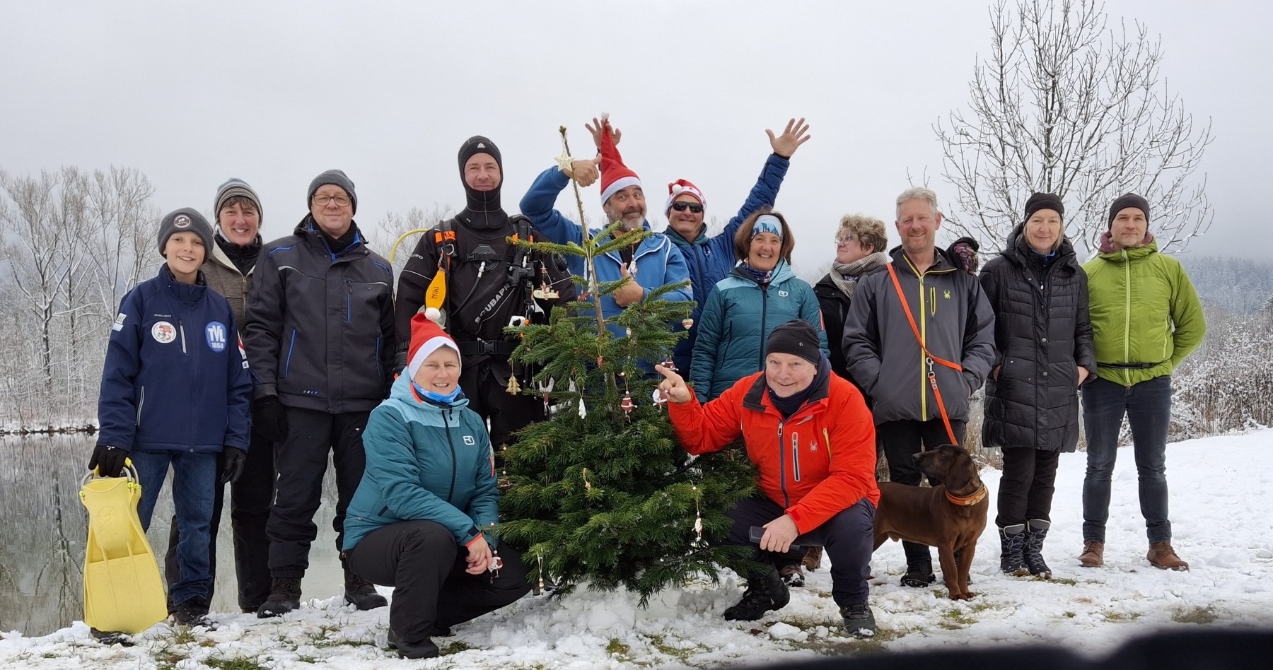 Tags zuvor hat es auch geschneit, so dass bei gezuckerter Landschaft die Stimmung passte. Am See angekommen, schmücken wir erst mal den Baum, damit er für das Gruppenfoto auch gut aussieht. Langsam macht sich Niki auch tauchfertig. Das Gruppen-Foto im Kasten, bzw. in den Handys, kann es dann auch losgehen. Natürlich wird der Schmuck vorher wieder abgelegt und wir können Niki und den Baum ins Wasser schicken. Ein letztes Winken und Baum und Taucher verschwinden unter die Wasseroberfläche.