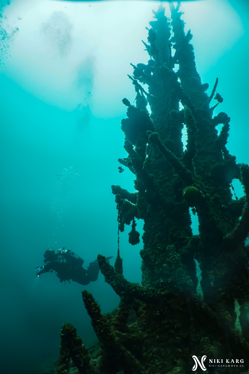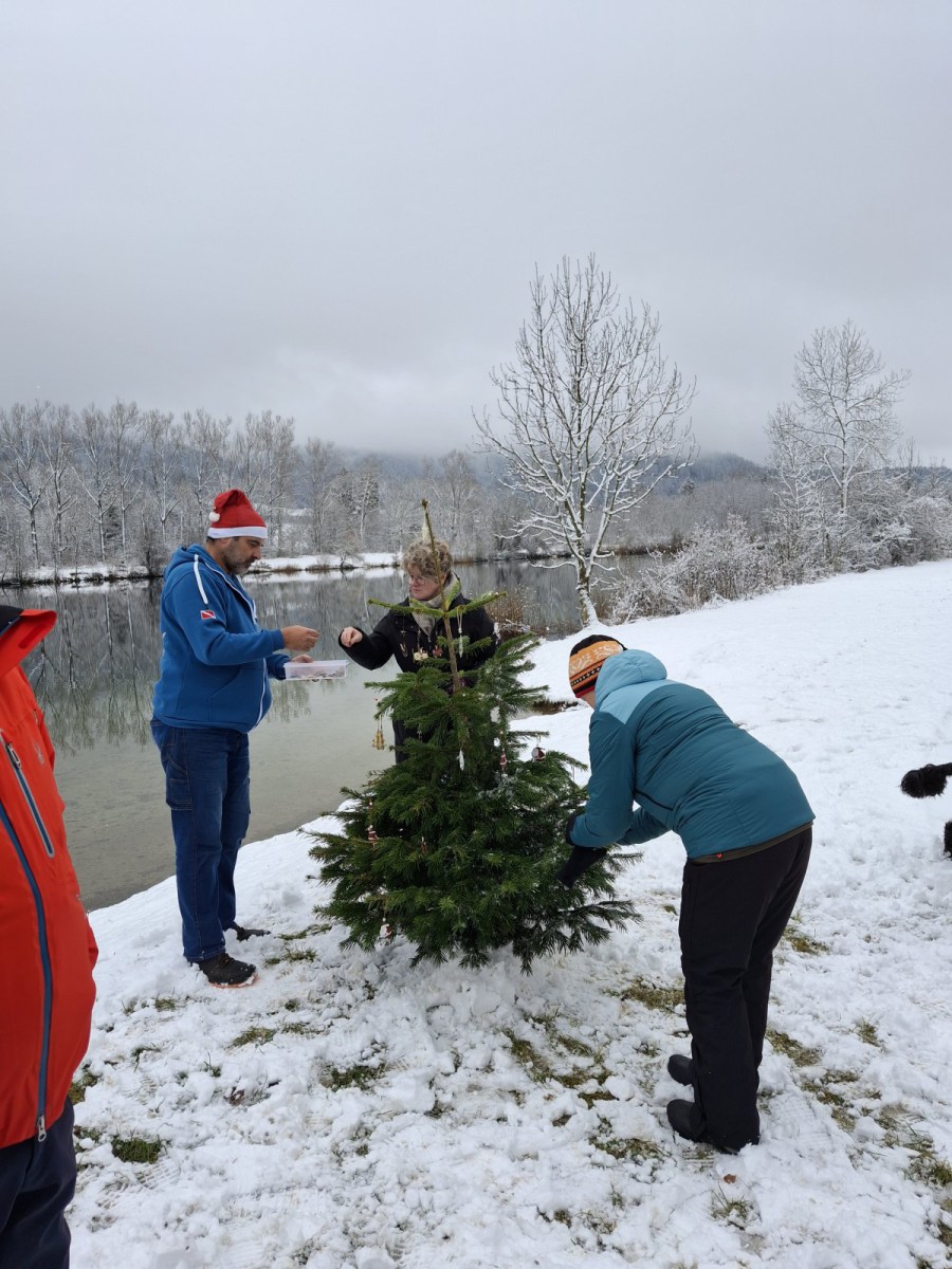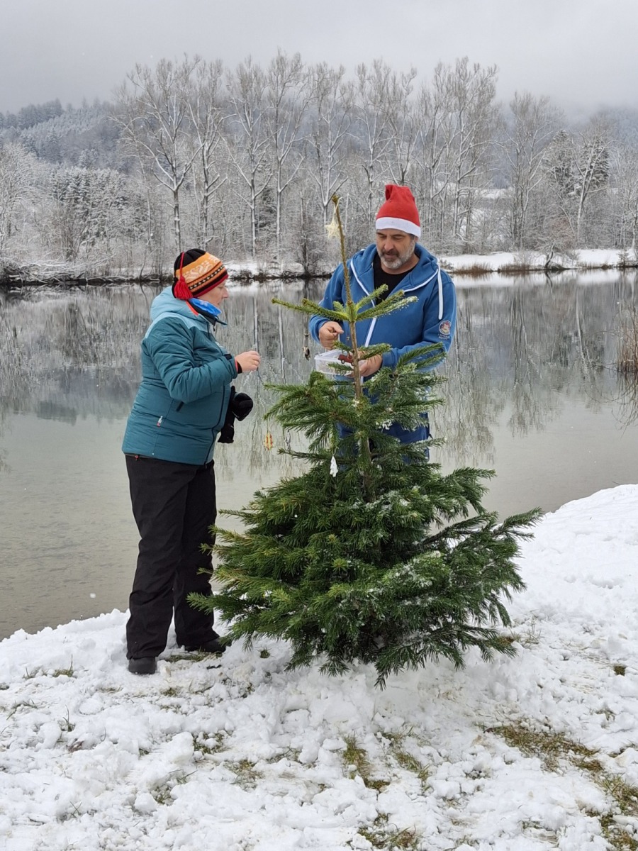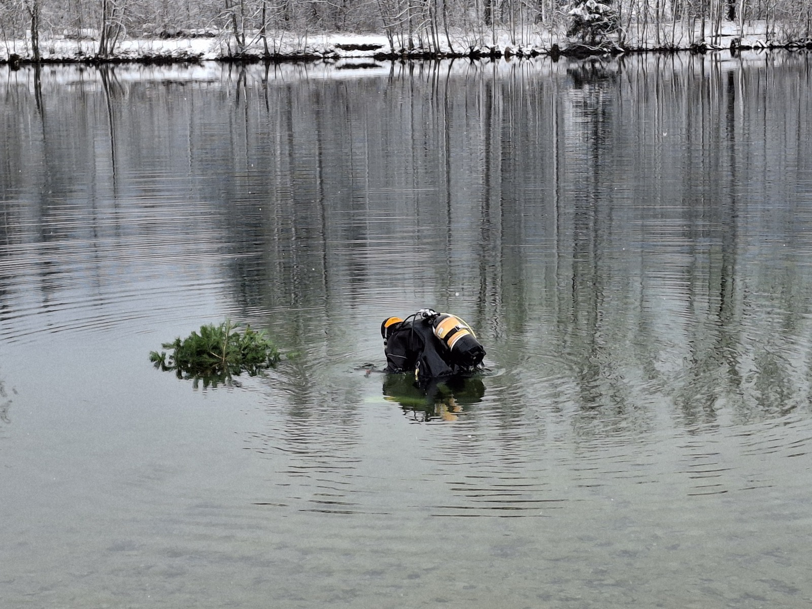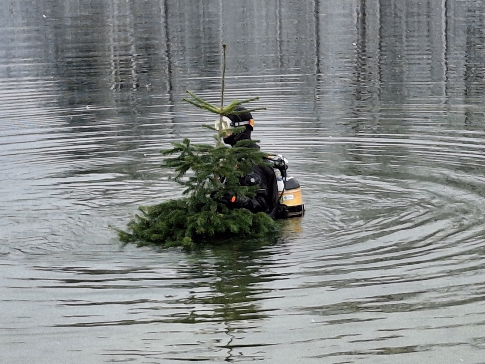 Tags zuvor hat es auch geschneit, so dass bei gezuckerter Landschaft die Stimmung passte. Am See angekommen, schmücken wir erst mal den Baum, damit er für das Gruppenfoto auch gut aussieht. Langsam macht sich Niki auch tauchfertig. Das Gruppen-Foto im Kasten, bzw. in den Handys, kann es dann auch losgehen. Natürlich wird der Schmuck vorher wieder abgelegt und wir können Niki und den Baum ins Wasser schicken. Ein letztes Winken und Baum und Taucher verschwinden unter die Wasseroberfläche.