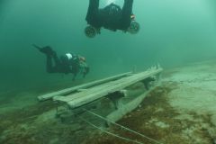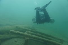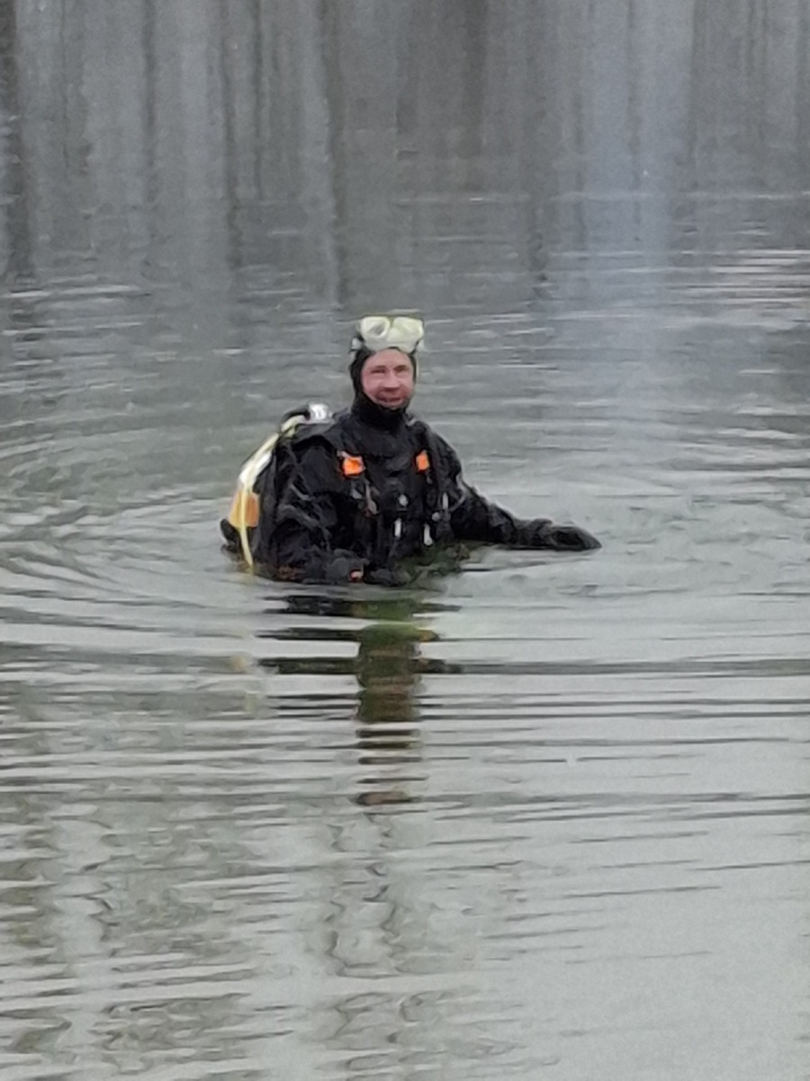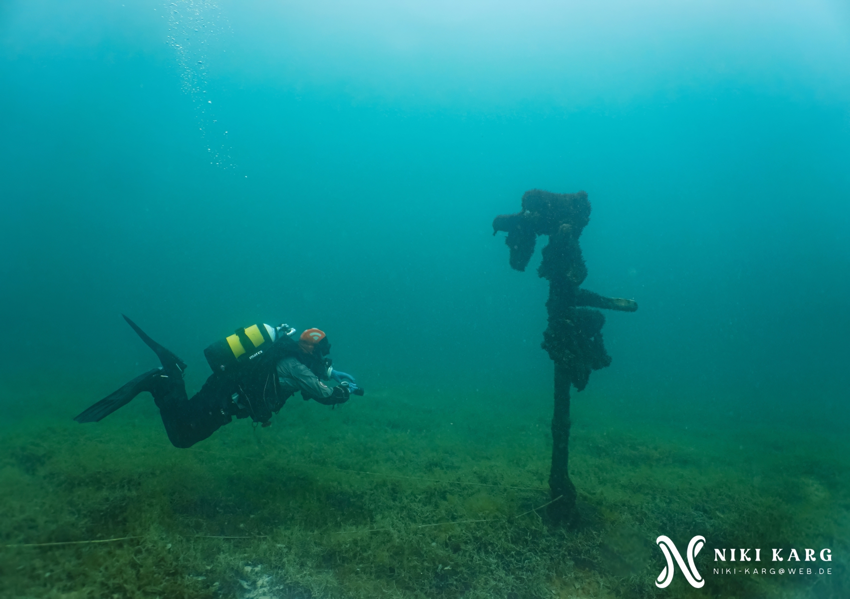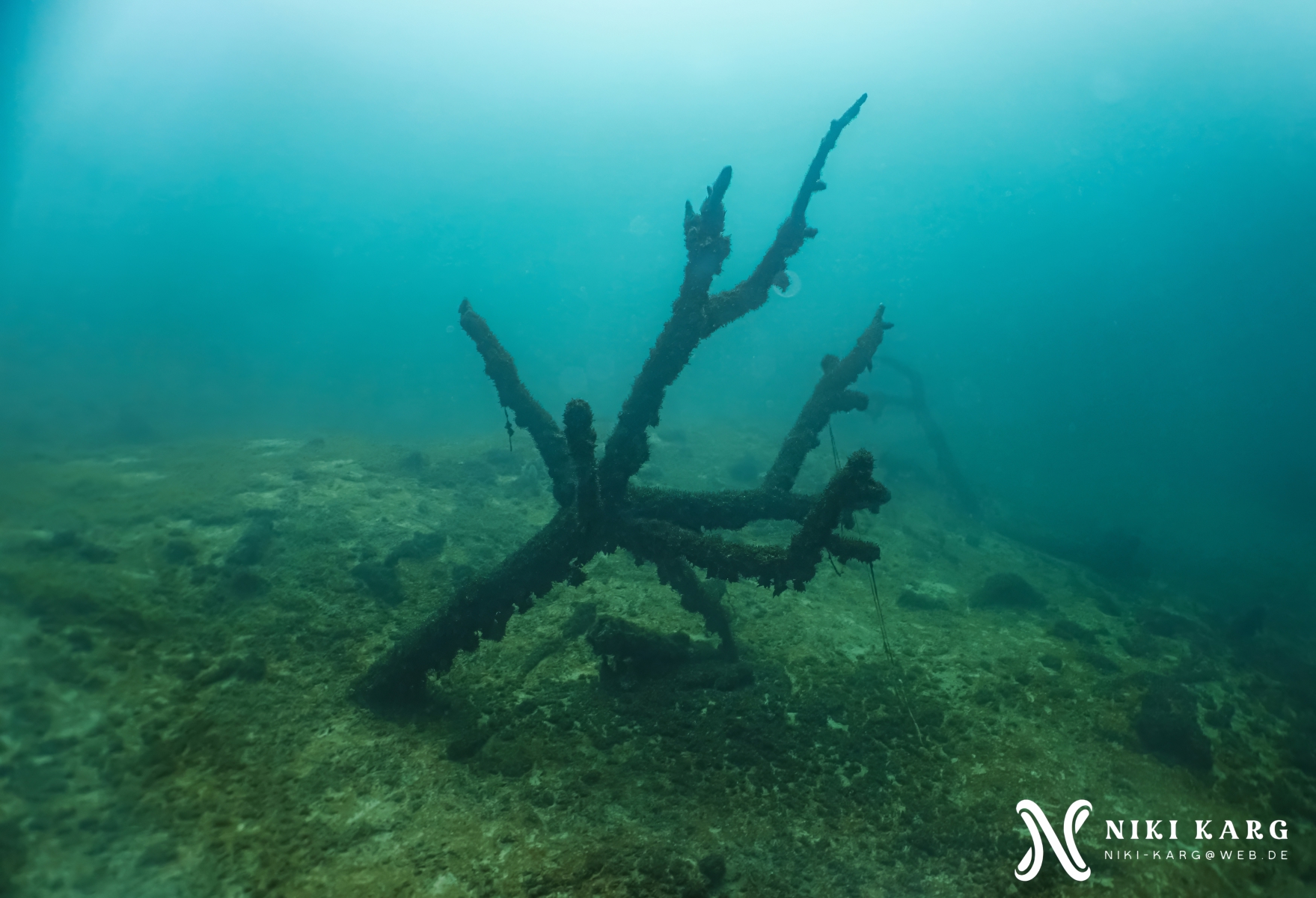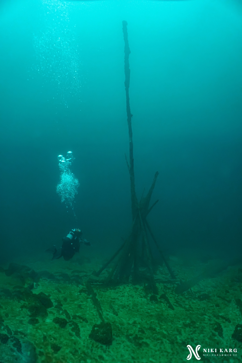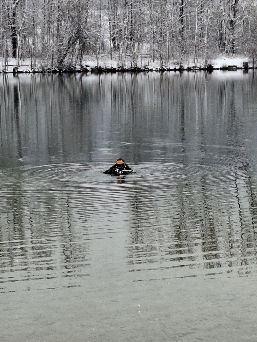 Tags zuvor hat es auch geschneit, so dass bei gezuckerter Landschaft die Stimmung passte. Am See angekommen, schmücken wir erst mal den Baum, damit er für das Gruppenfoto auch gut aussieht. Langsam macht sich Niki auch tauchfertig. Das Gruppen-Foto im Kasten, bzw. in den Handys, kann es dann auch losgehen. Natürlich wird der Schmuck vorher wieder abgelegt und wir können Niki und den Baum ins Wasser schicken. Ein letztes Winken und Baum und Taucher verschwinden unter die Wasseroberfläche.