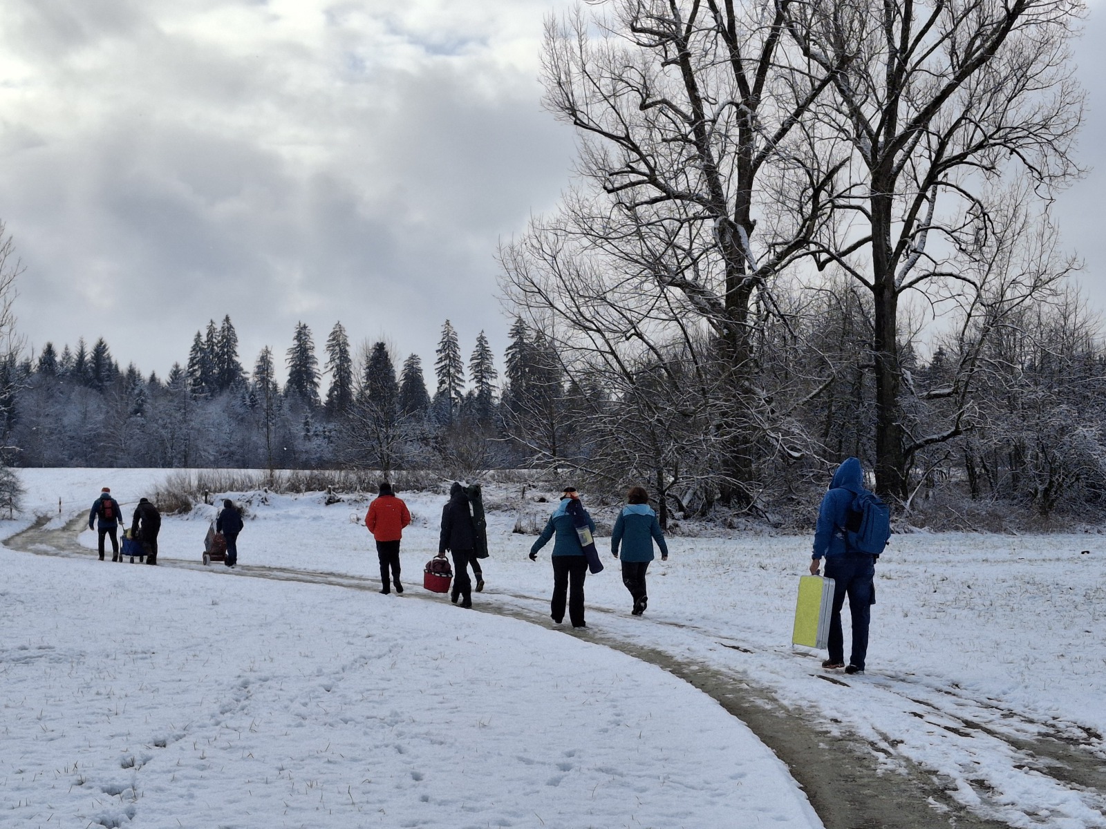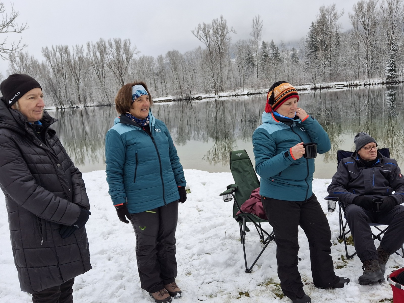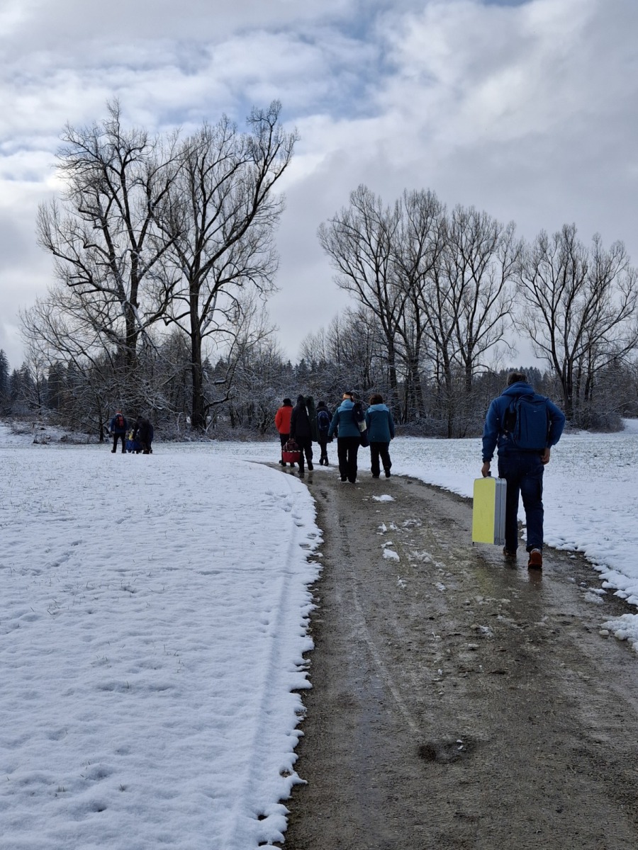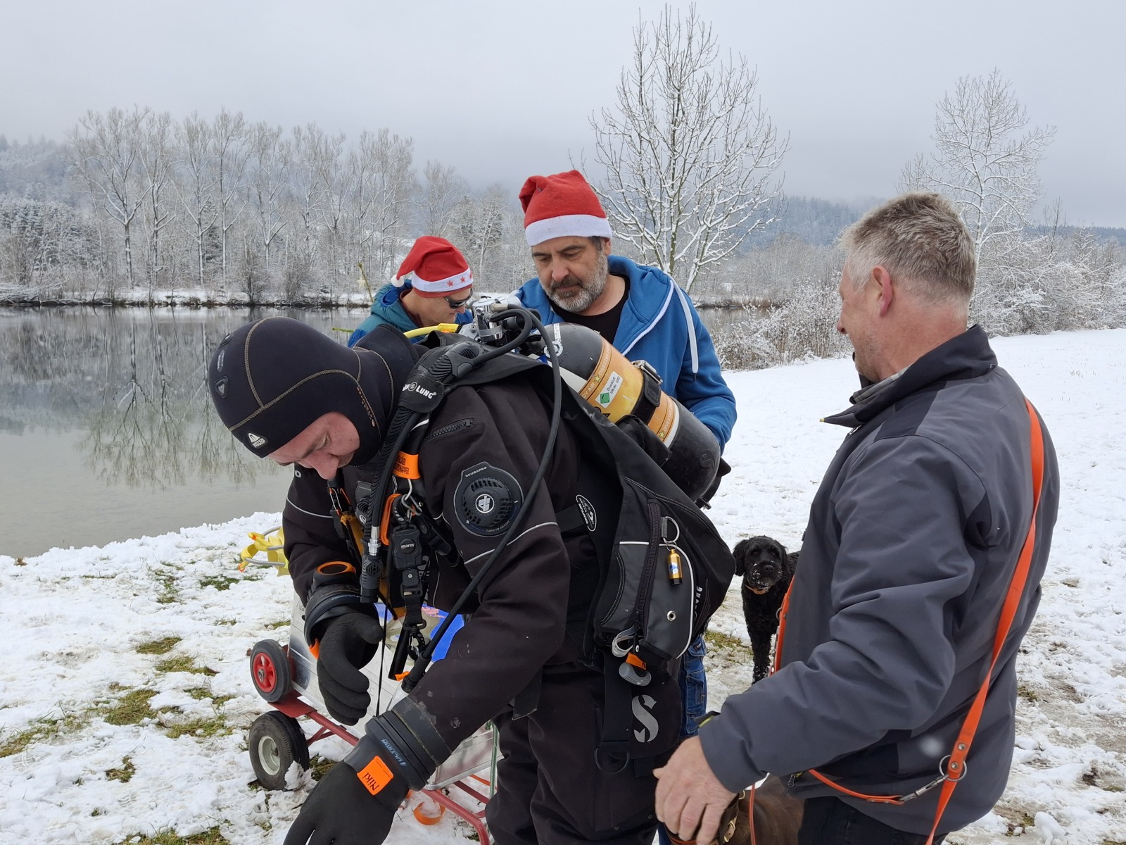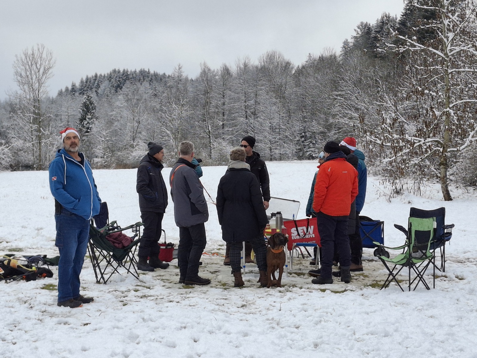 Dreizehn Taucher*innen treffen sich um 11 Uhr am Parkplatz am Isnyer Baggersee. Bepackt mit Wiener, Weißwürste, Brot, Plätzchen, Lebkuchen, Glühwein und Punsch machen wir uns auf dem Weg an den See. Weihnachtsbaum, Christbaumschmuck und Tauchequipment dürfen sowieso nicht fehlen.